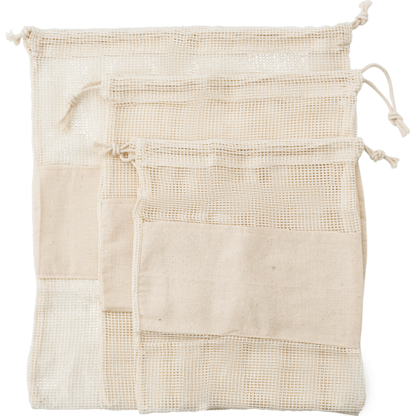 Set de tres bolsas de malla de algodón reutilizables.
