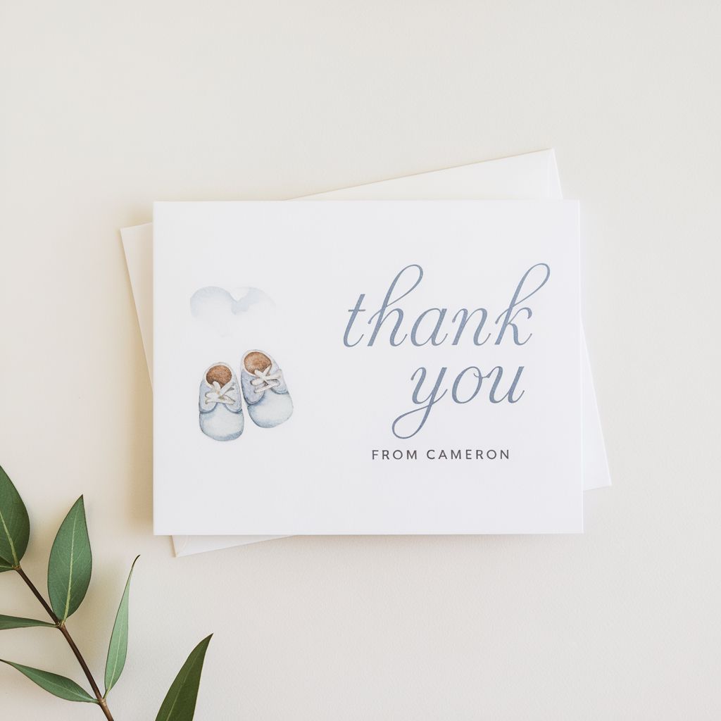 Tarjetas de agradecimiento reflexivas después de eventos de bebé niño. Personalizable con nombres, mensajes y fotos. Ideal para regalos y asistentes a la fiesta.